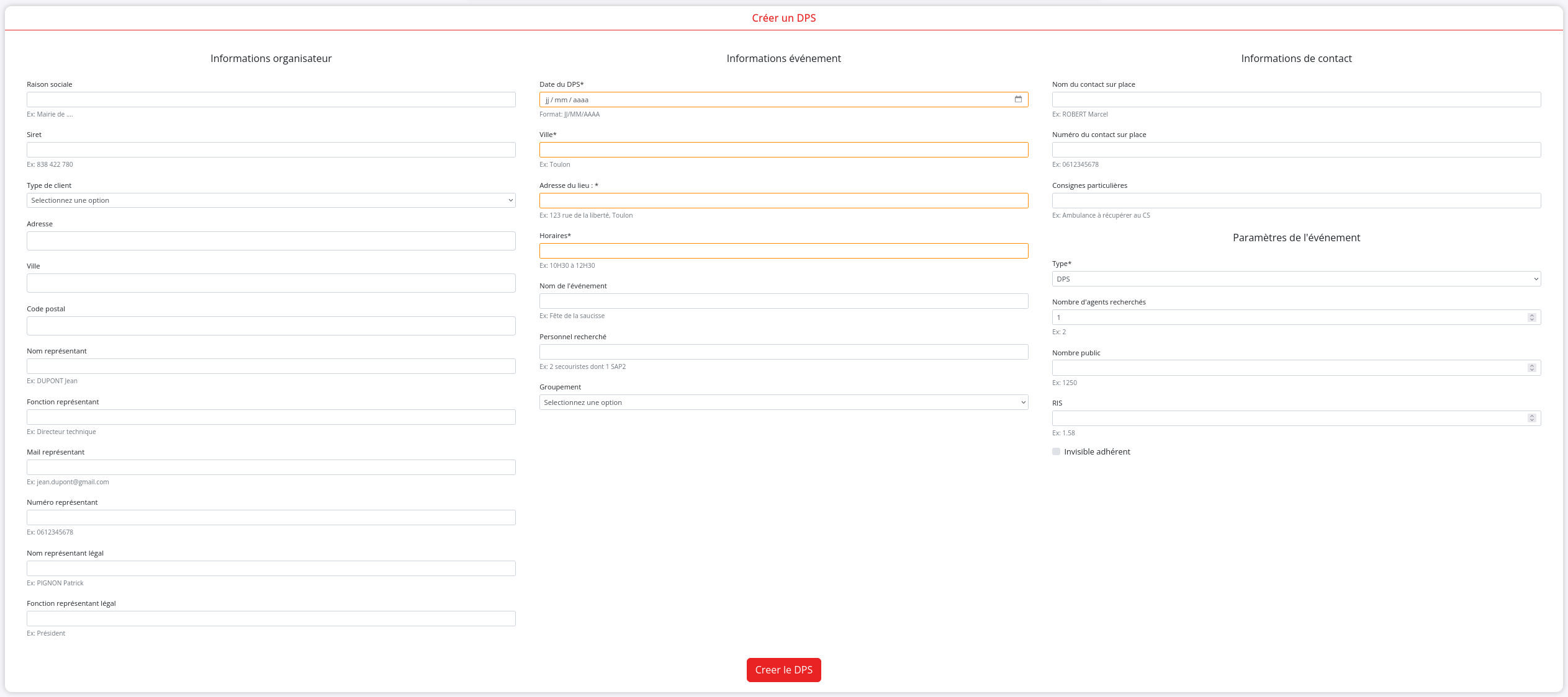 De la même manière que pour les formations, les DPS peuvent être créés de deux manières différentes. Soit via le formulaire de demande sur la page d'accueil, soit par une création manuelle.