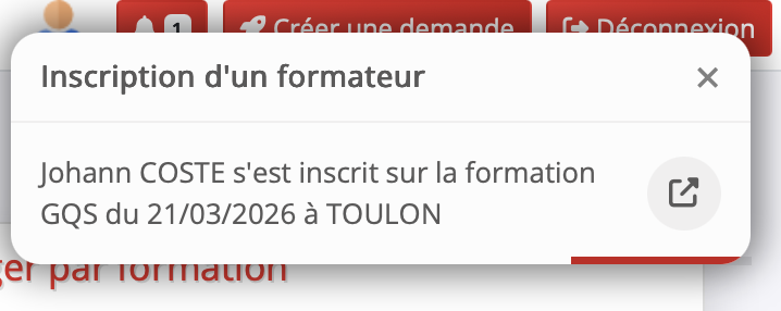 Ce sont des alertes visuelles qui apparaissent temporairement en haut à droite de votre écran pour vous informer d'un nouvel événement sans interrompre votre navigation (par exemple, "Nouvelle demande de DPS reçue"). En cliquant sur la croix pour fermer le ballon, la notification est automatiquement marquée comme lue. Si vous laissez le temps s'écouler et que la notification se ferme seule, elle sera considérée comme non lue.