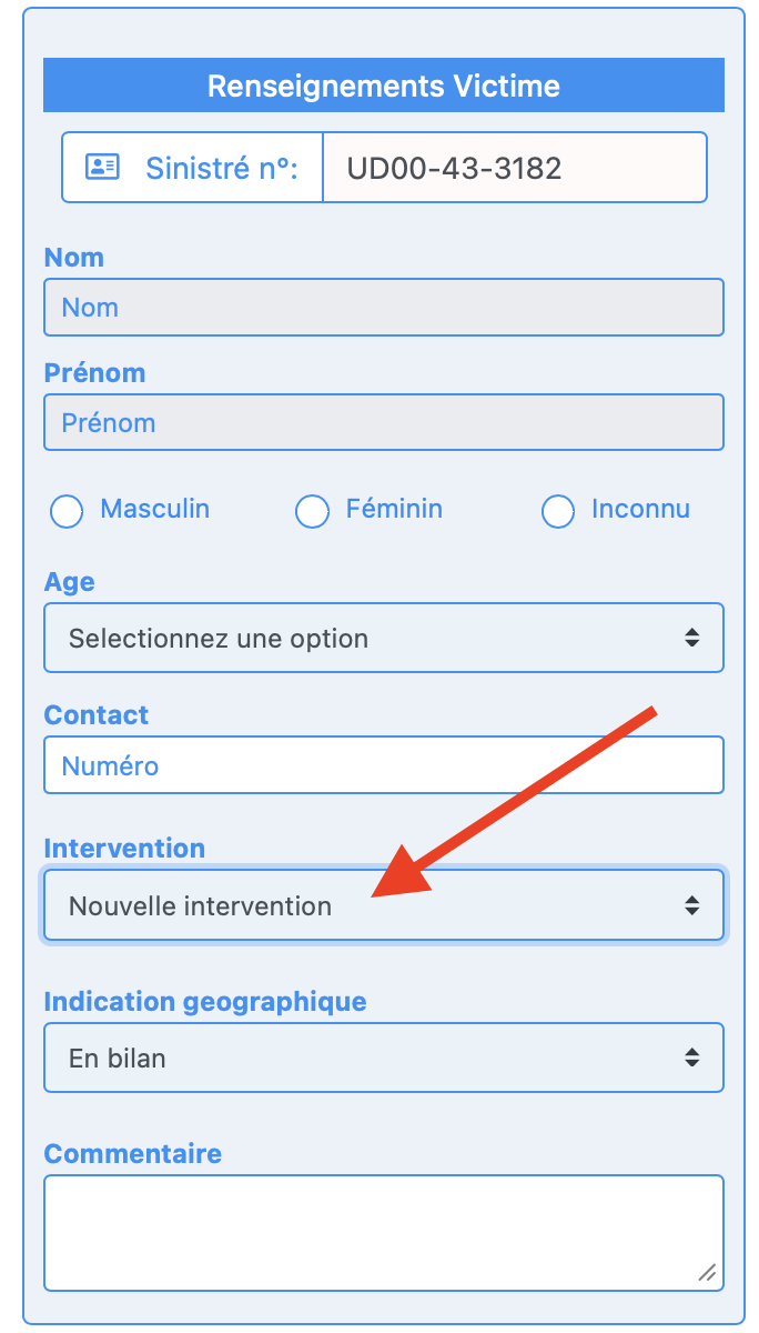 Pour ce faire le secouriste doit impérativement sélectionner « Nouvelle intervention » dans le champ Intervention de la fiche bilan.