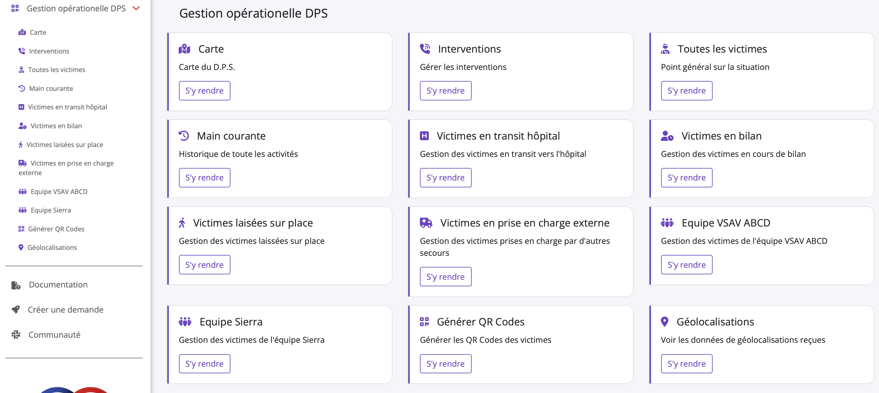 - Main Courante : Un journal d'événements qui retrace de manière chronologique toutes les actions (création d'intervention, prise en charge de victime, changement de statut...).