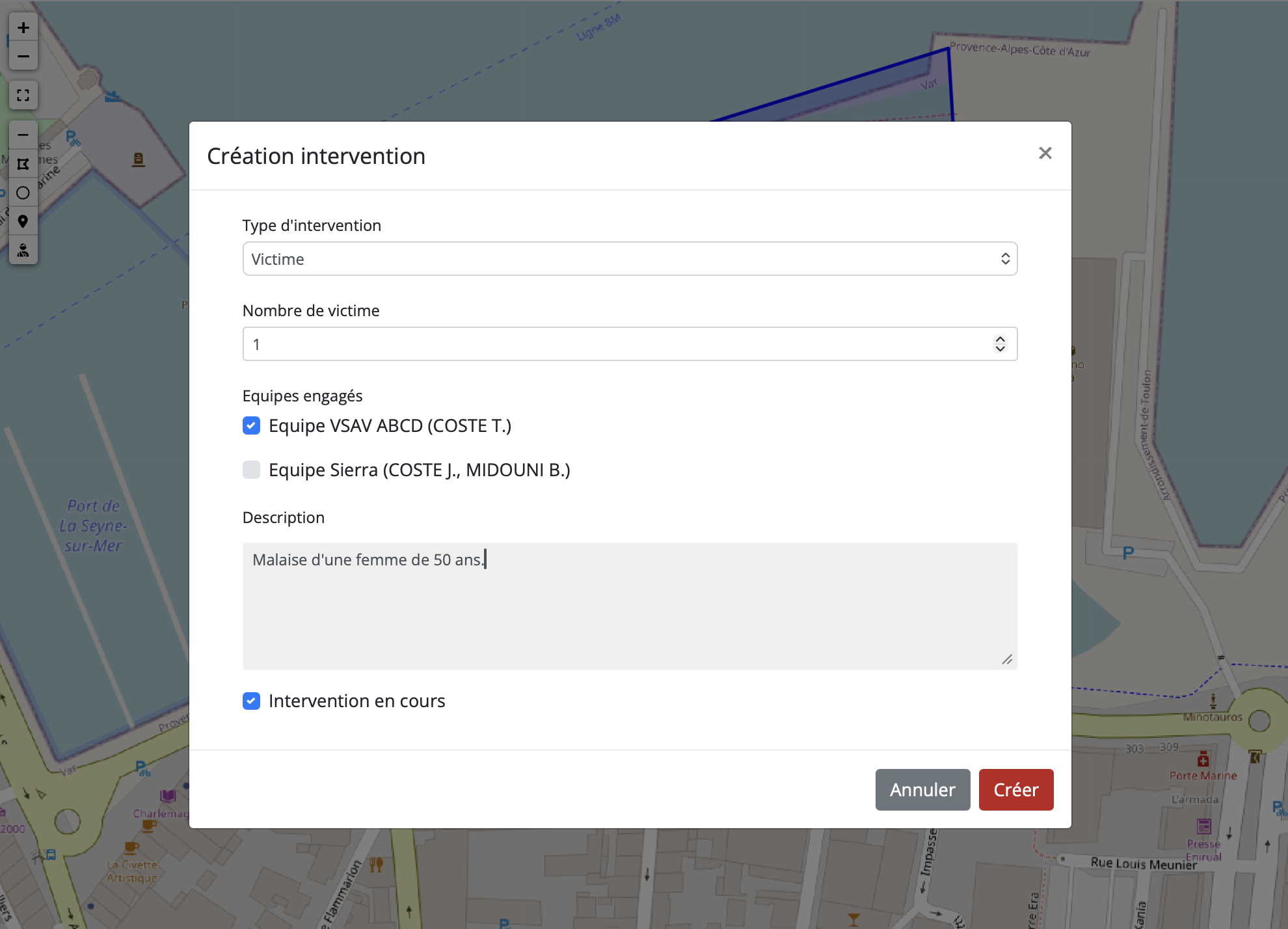 - Créer une intervention : En cliquant sur la carte, vous pouvez initier une nouvelle intervention (voir ci-dessous).