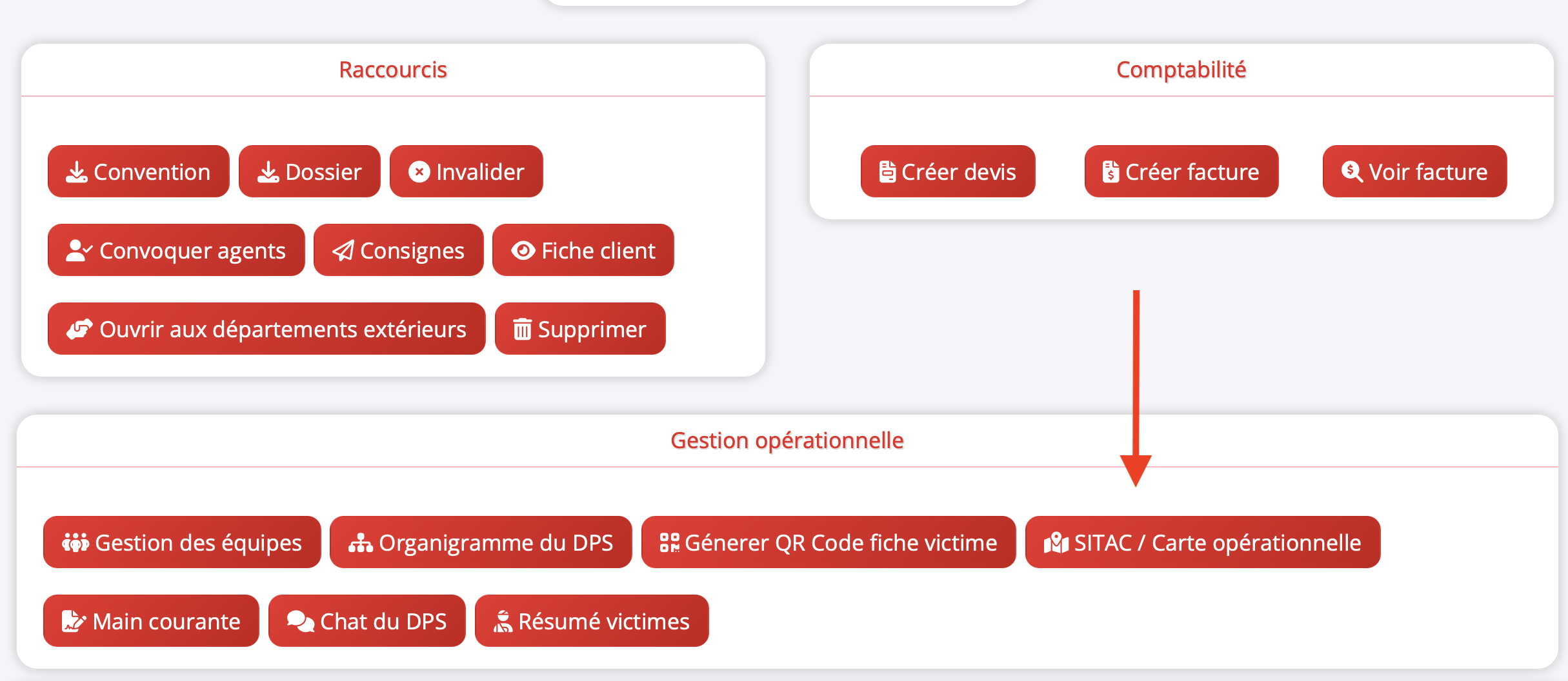 Le jour du DPS, si les conditions d'accès sont remplies, la section "Gestion opérationelle DPS" apparaît dans votre menu. Elle contient plusieurs outils pour le pilotage en temps réel.