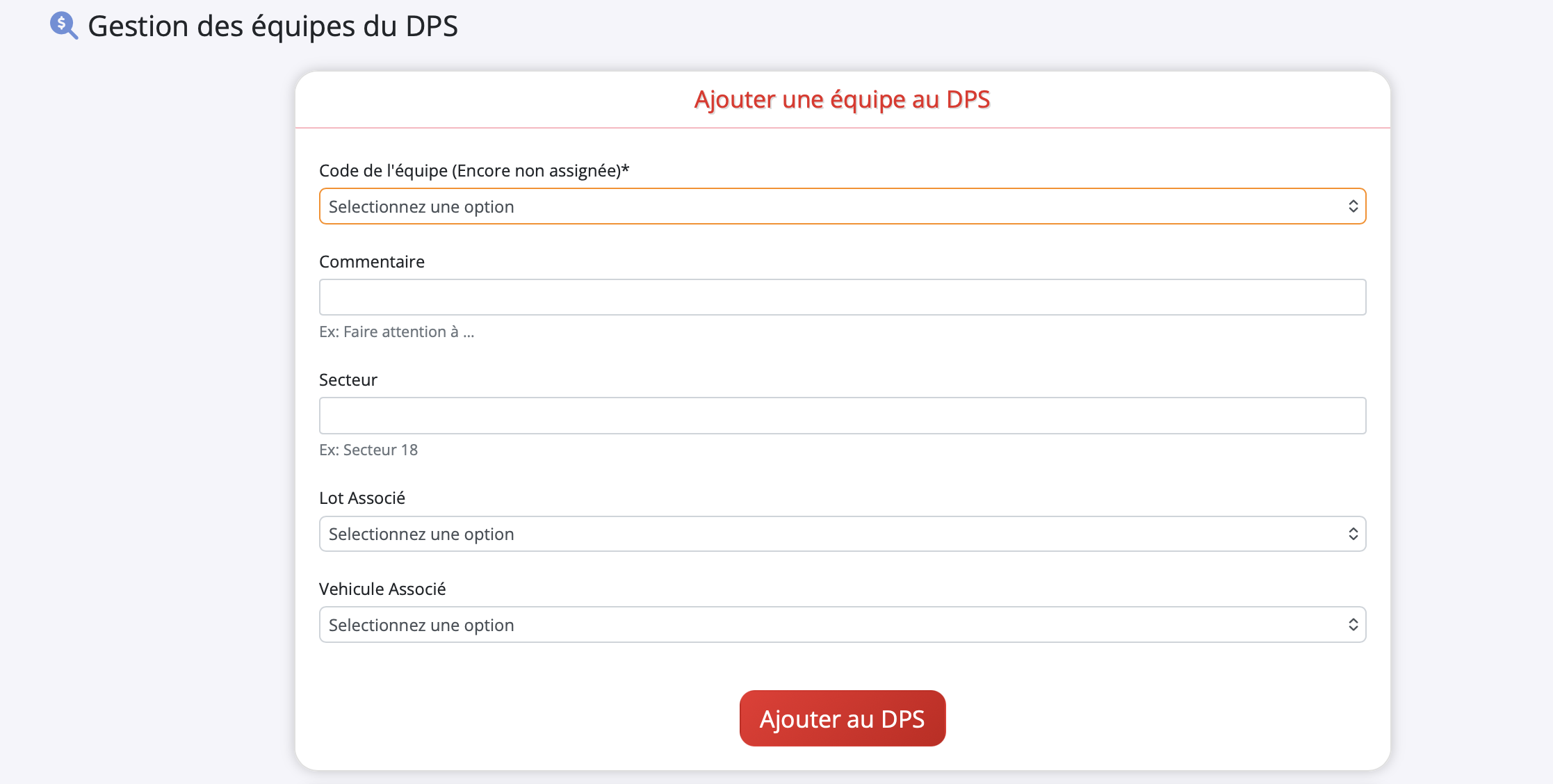 - Assigner une équipe au DPS : Liez un de vos modèles d'équipe (ex: "Equipe 1") à ce DPS spécifique.